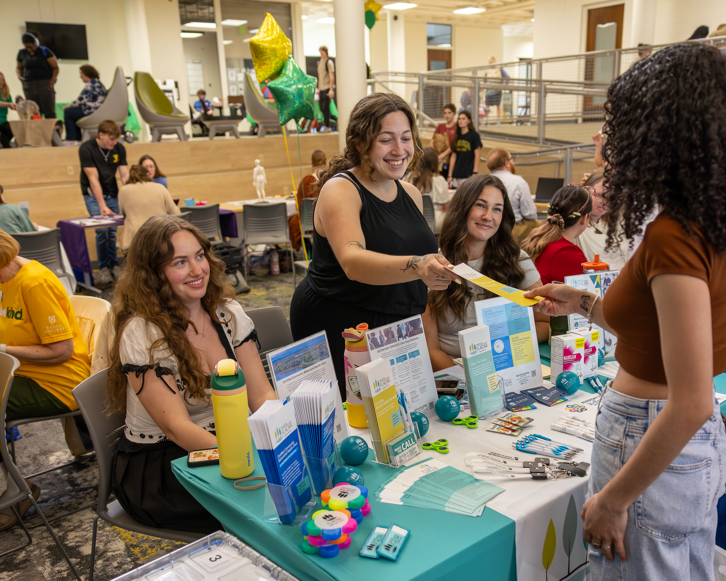 Nearby, first-year student Sam Teeter, a unified childhood special education major from Webster, N.Y., received a temporary butterfly tattoo at a body-positivity booth station from Mental Health Counselor Brandi Sears. The tattoos, Brandi said, symbolized kindness to one’s body and a rejection of self-harm and negative thoughts. Other displays encouraged students to rethink labels and embrace natural appearances.